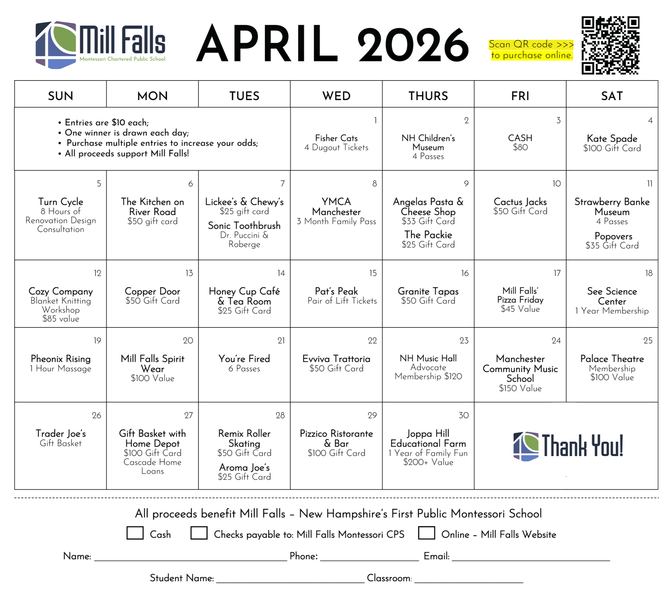 We will call/email the lucky the daily winners and announce the winners on our FaceBook Page: www.facebook.com/MillFallsCharterSchool